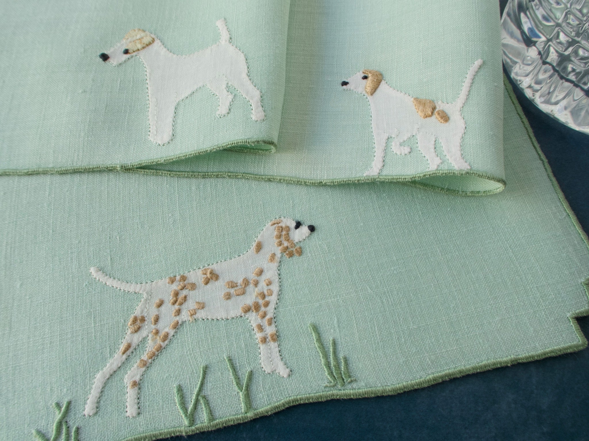 Booze hounds on hand. Vintage linen cocktail napkins, hand embroidered in Madeira.