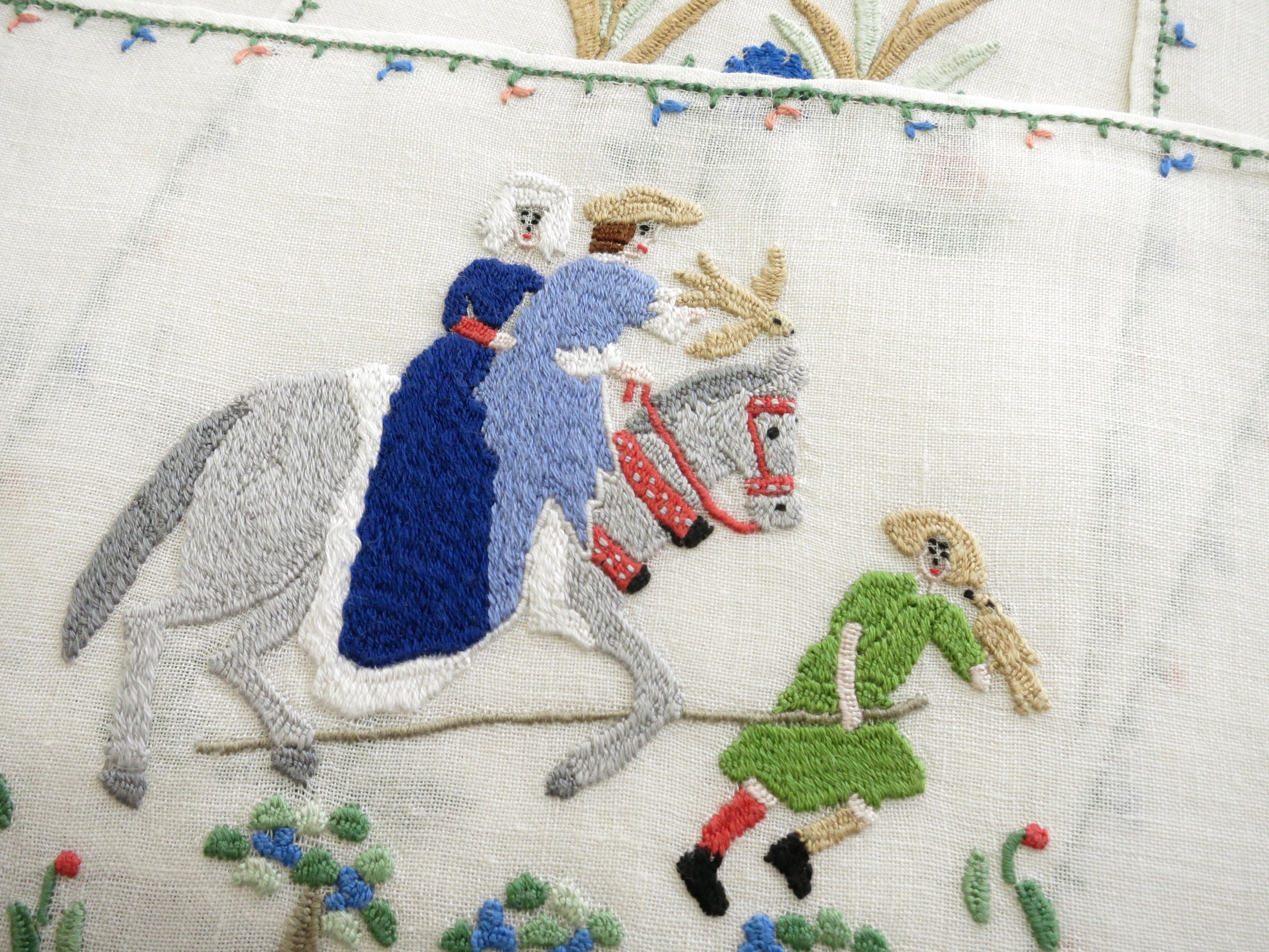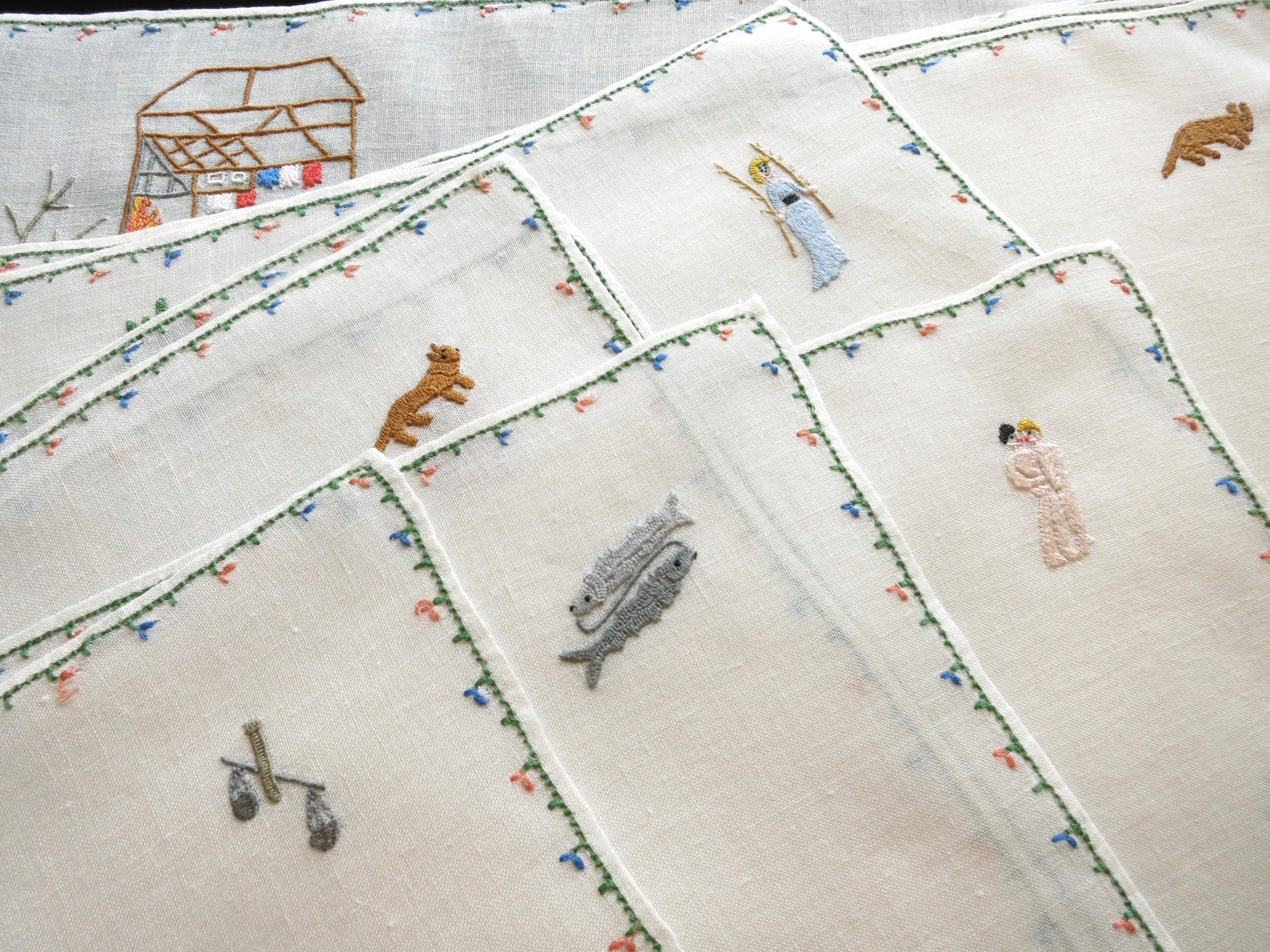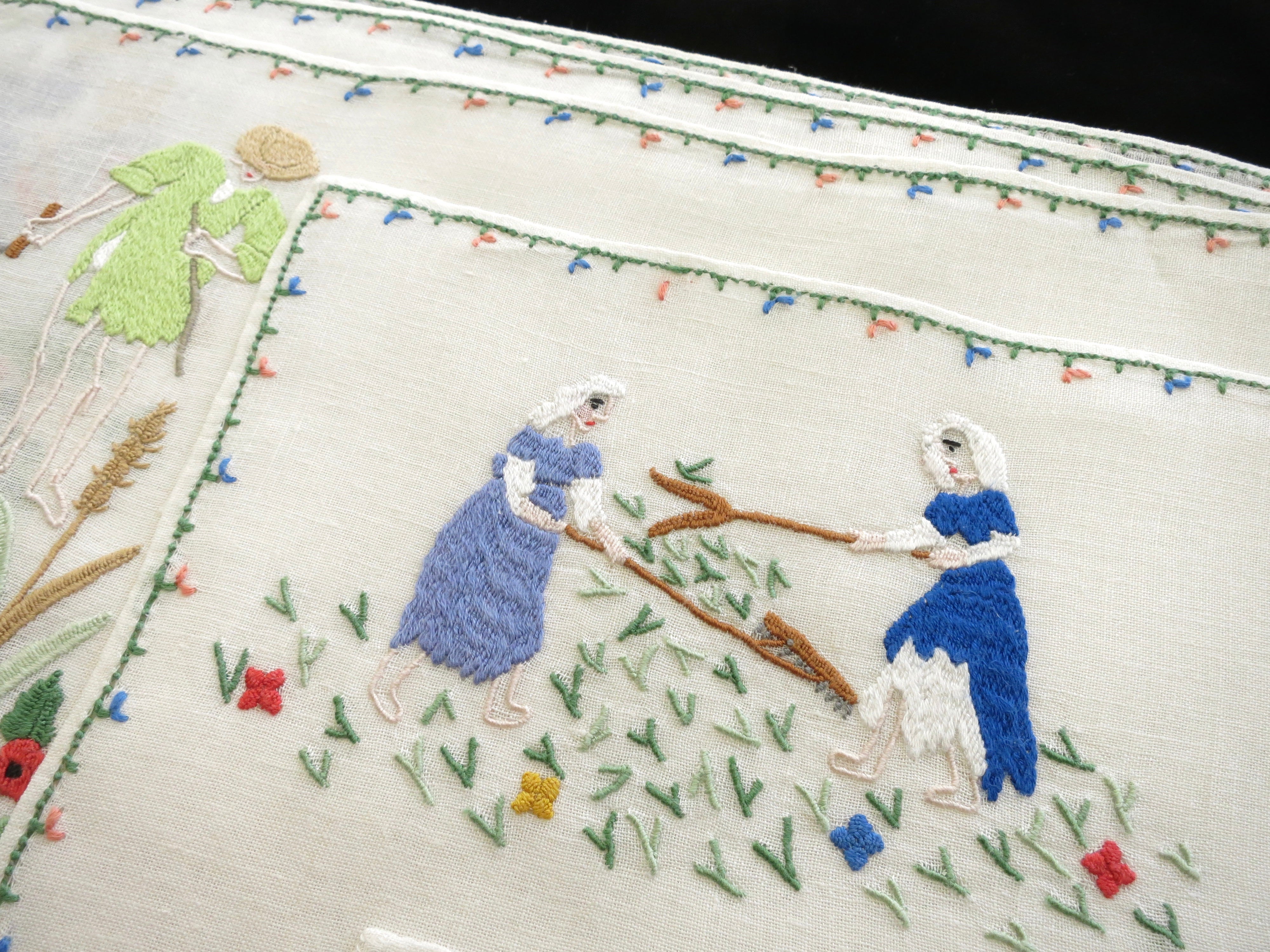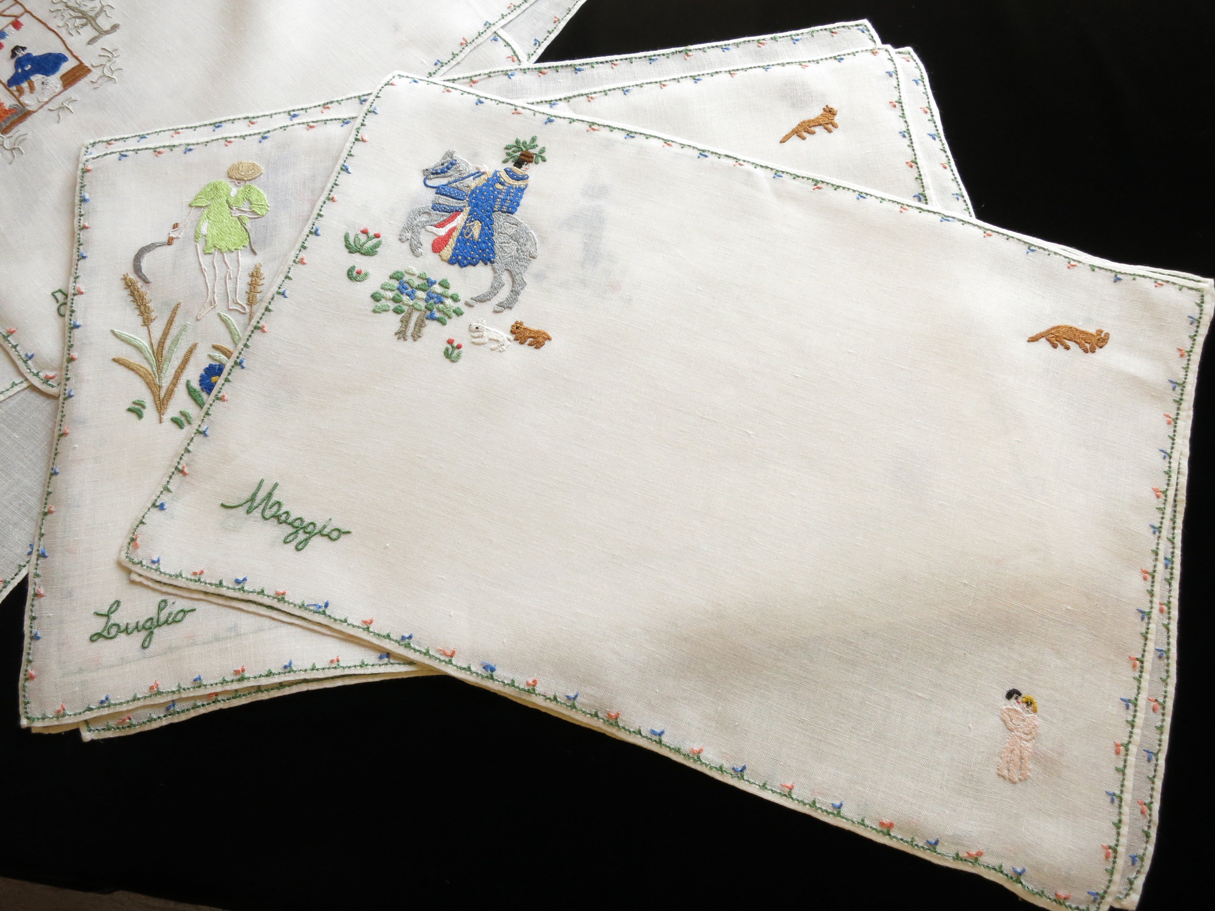 Rare vintage placemats, featuring the twelve months of the year in medieval theme. Italian hand embroidery, circa 1960, these are elusive treasures from the Baroness Rapisardi. We love Rapisardi linens, with their rich colors and unusual motifs—ultra charming, and always beautiful.