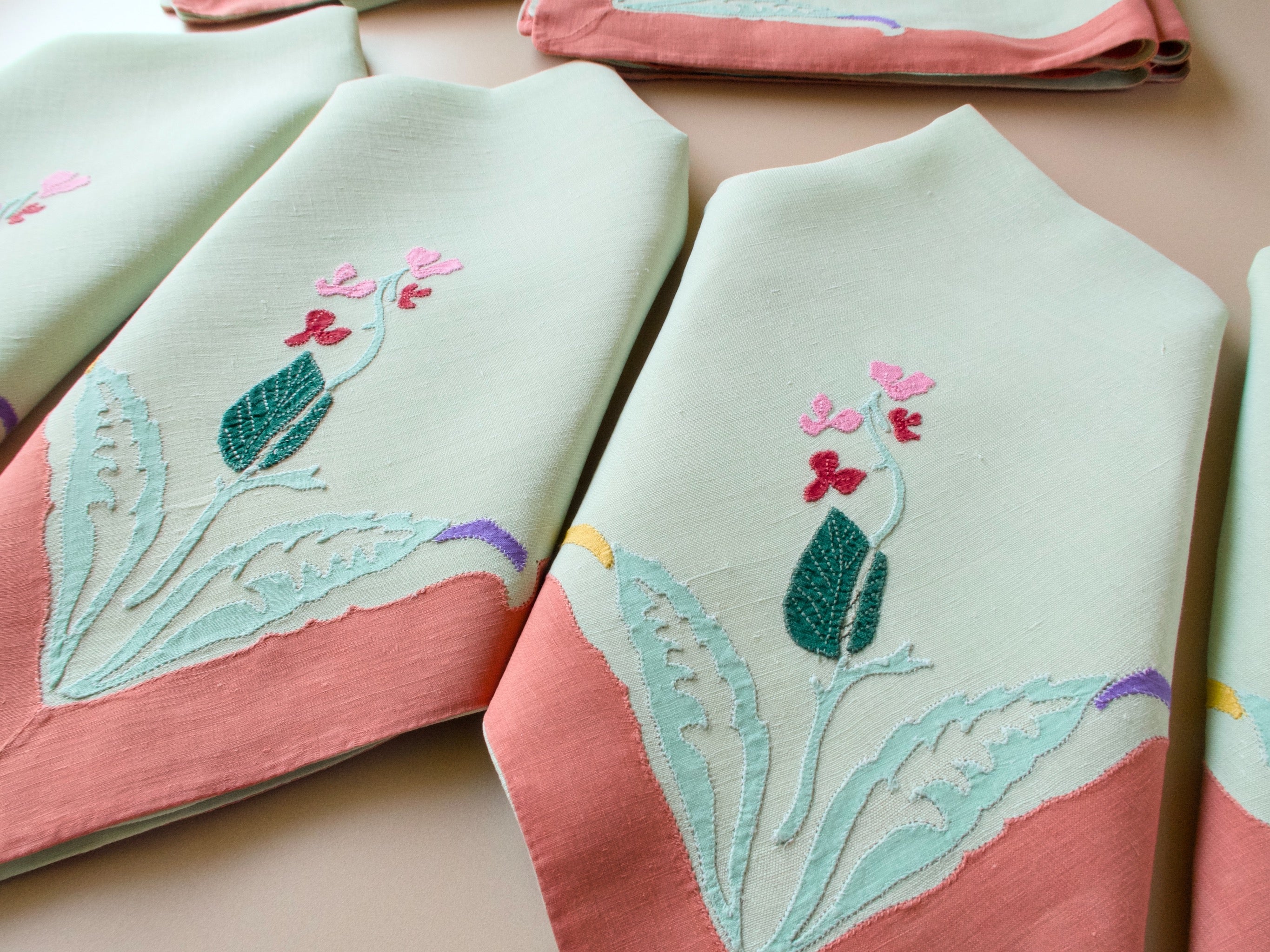 Mid-century French appliqué napkins in soft sage linen, with warm coral borders and stylized florals. Generous in size, striking in design.
