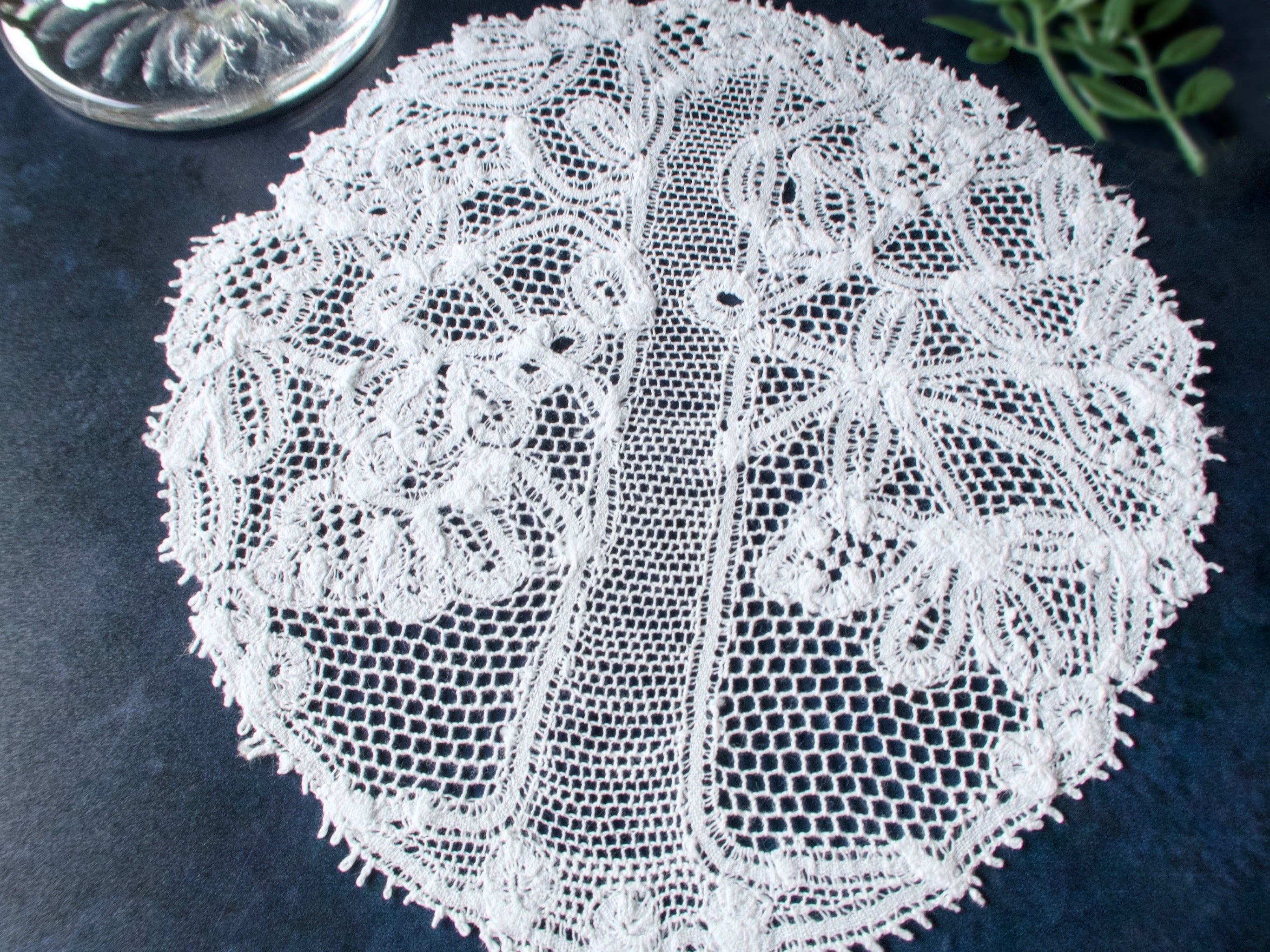Airy Renaissance lace cocktail rounds featuring a stylized tree motif. Intricate and unusual under a glass.