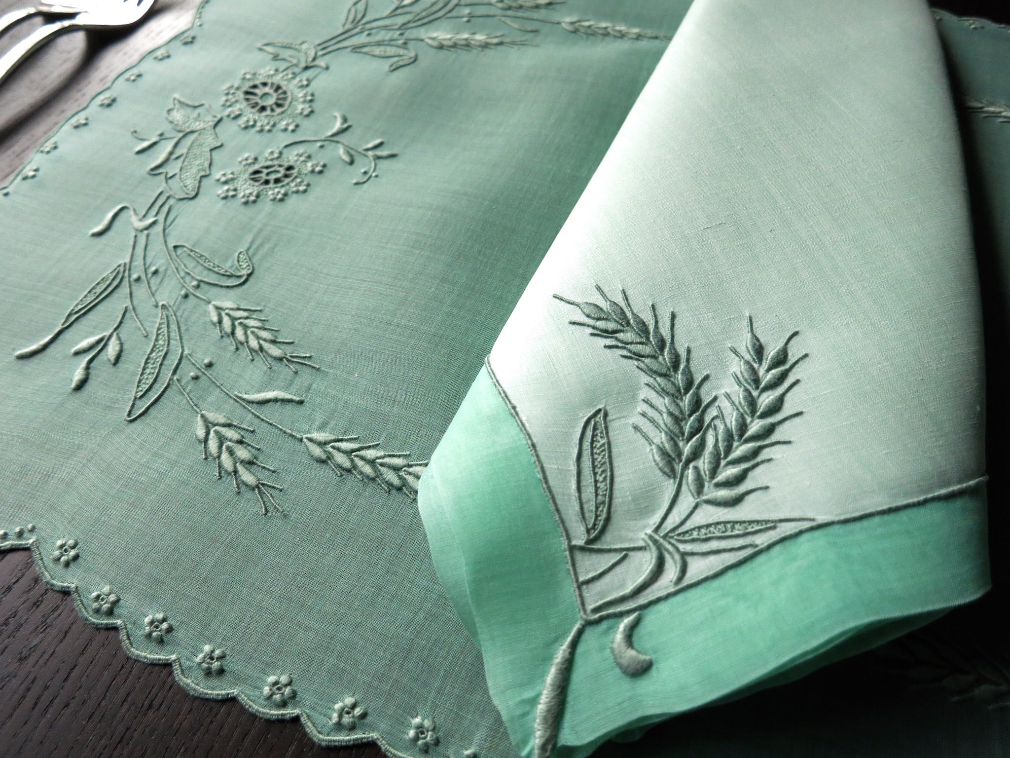 Vintage Marghab "Wheat" placemat set in a rare shade of green, hand embroidered in Madeira. A beautiful example of the pattern, with the fine detailing only Marghab delivers.