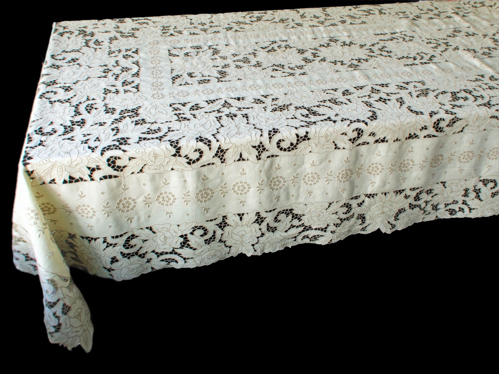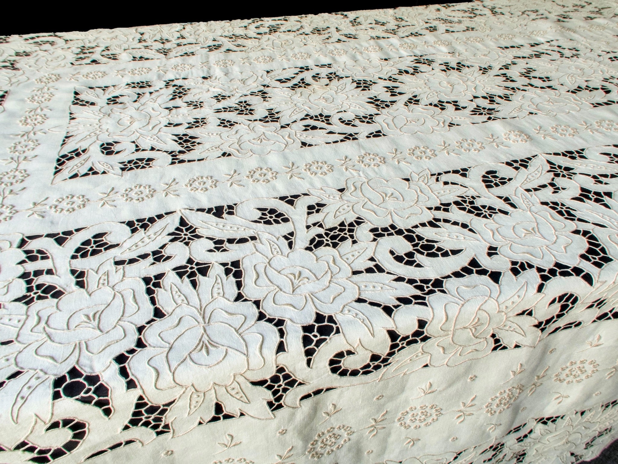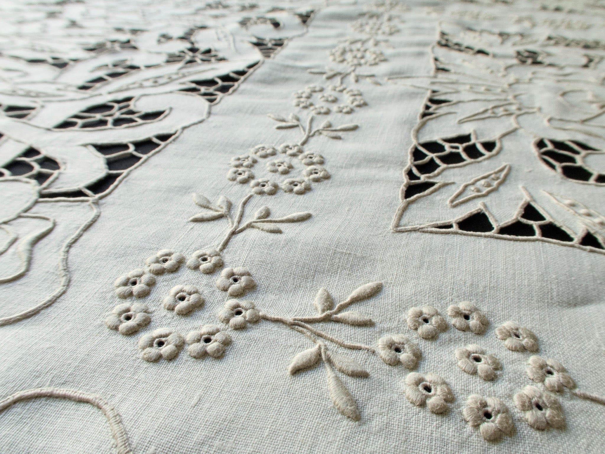 An extraordinary handmade Madeira tablecloth of monumental proportions—over 22 feet long—featuring intricate Richelieu cutwork and three-dimensional embroidery on linen. The flowing floral design, worked in satin and padded stitches, showcases meticulous craftsmanship on a truly impressive scale. A masterpiece for formal entertaining, grand dining, embassy receptions — or just a huge Thanksgiving crowd.