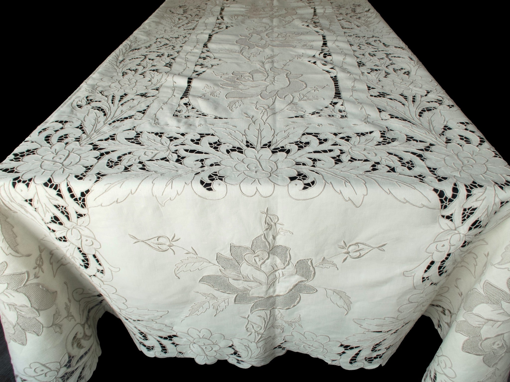 An extraordinary handmade Madeira tablecloth of monumental proportions—over 22 feet long—featuring bold rose motifs and fine Richelieu cutwork embroidery on light ecru linen. The design is distinguished by sculptural blossoms and deeply padded stitching, creating rich dimensional contrast across the surface. A masterpiece for formal entertaining, grand dining, embassy receptions — or just a huge Thanksgiving crowd.
