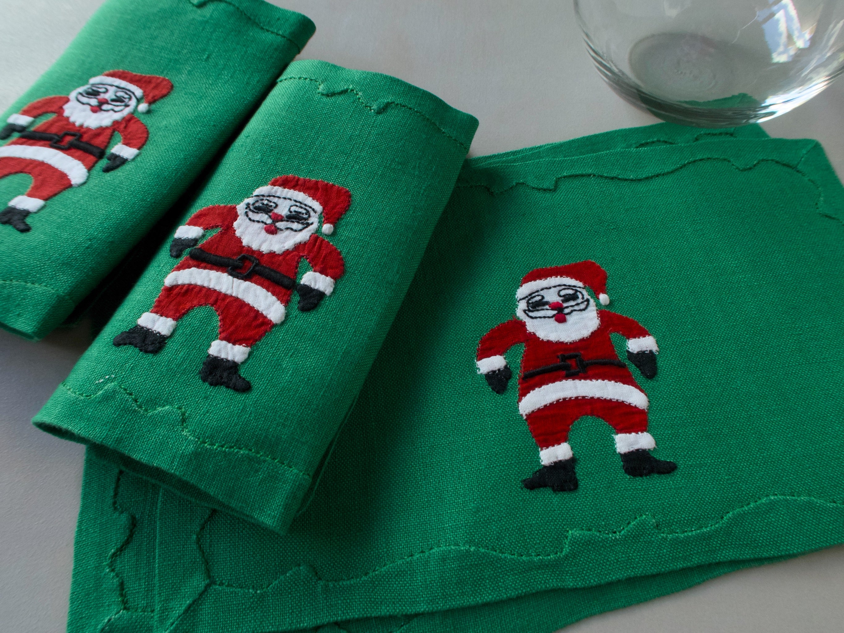 Vintage linen cocktail napkins, hand embroidered in Madeira. Bright green linen with a cheerful Santa in beautifully worked appliqué — festive and fun.