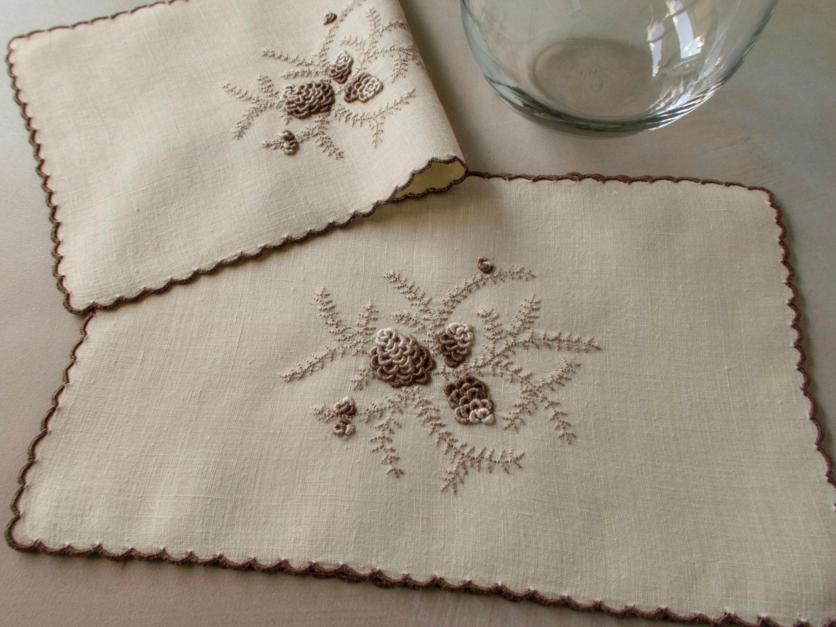 Vintage Marghab “Pine Cones” linen cocktail napkins in a rich brown colorway, hand embroidered in Madeira with raised pinecone motifs and scalloped edges. Detailed, dimensional stitching in natural brown shades—perfect for winter & holiday tables. A lush, gorgeous pattern.