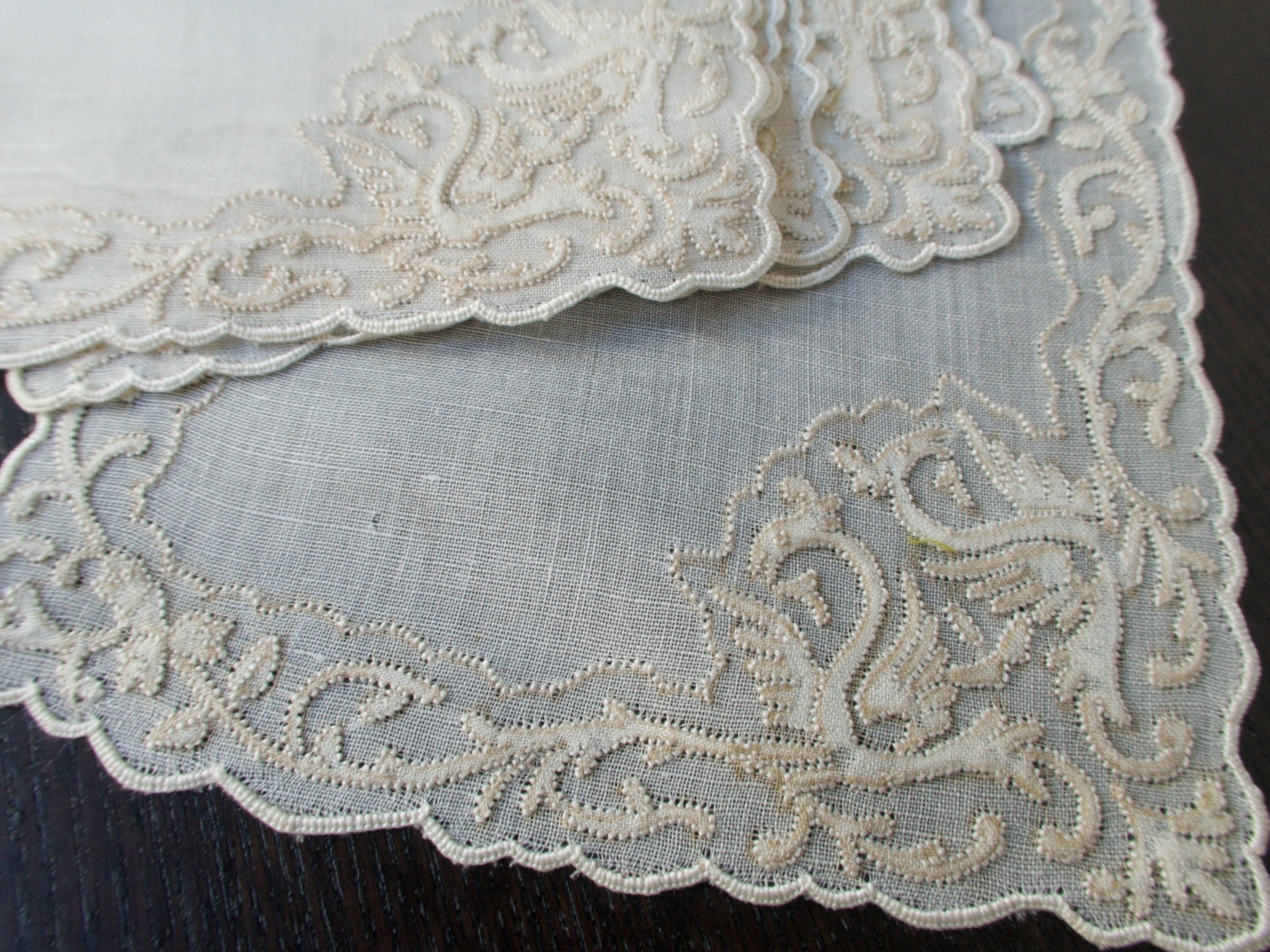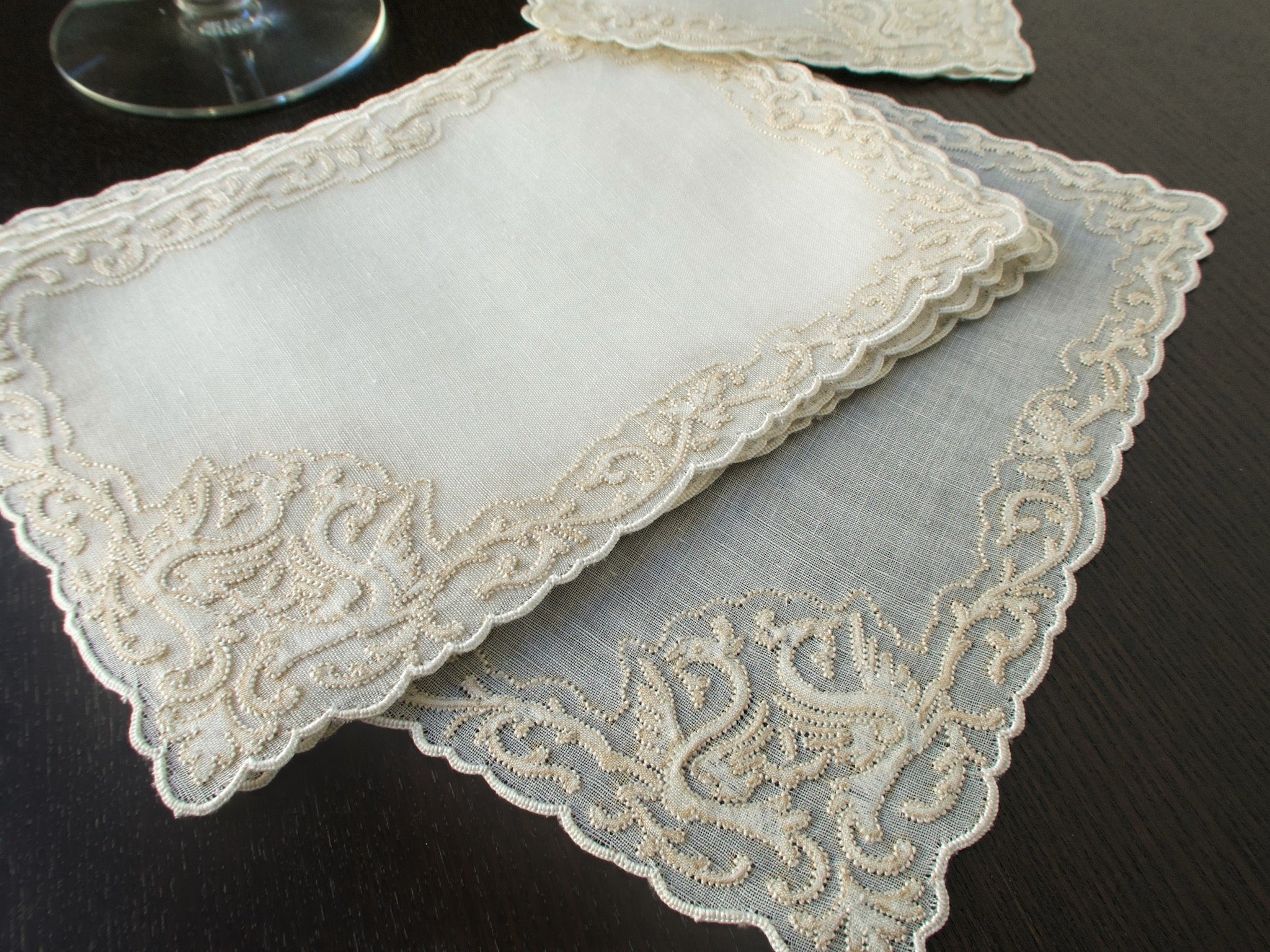 Striking vintage Italian cocktail napkins, direct from Rome, finely worked in punto ombra embroidery—a technique prized for its subtle shading and sculptural relief. Each napkin features a pair of stylized dragons, framed by scrolling borders. Exquisite embroidery on linen that’s almost sheer.