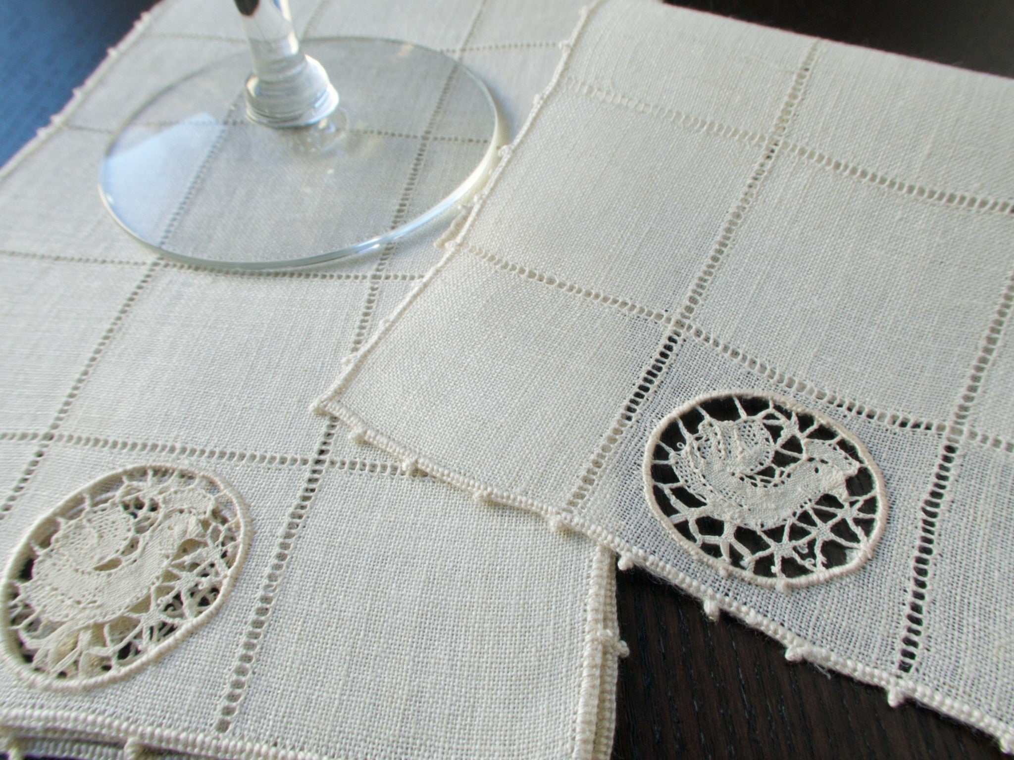Charming vintage Italian cocktail napkins, each featuring a handmade bobbin lace rooster—that classic emblem of conviviality and good cheer. The lace is set into linen embellished with drawnwork and finished with tiny picot edges. Direct from Rome. Fun, spirited, and full of Italian style.