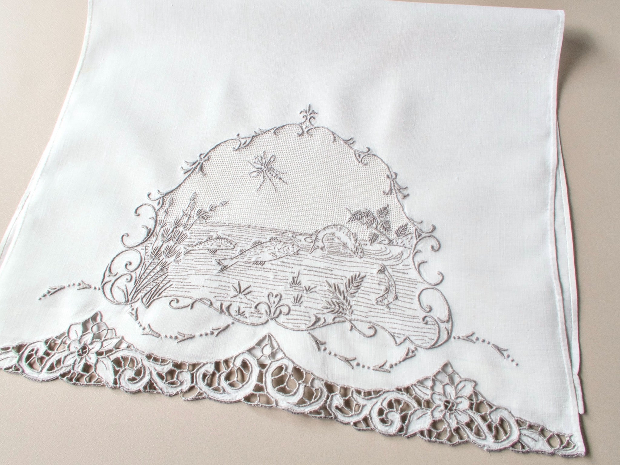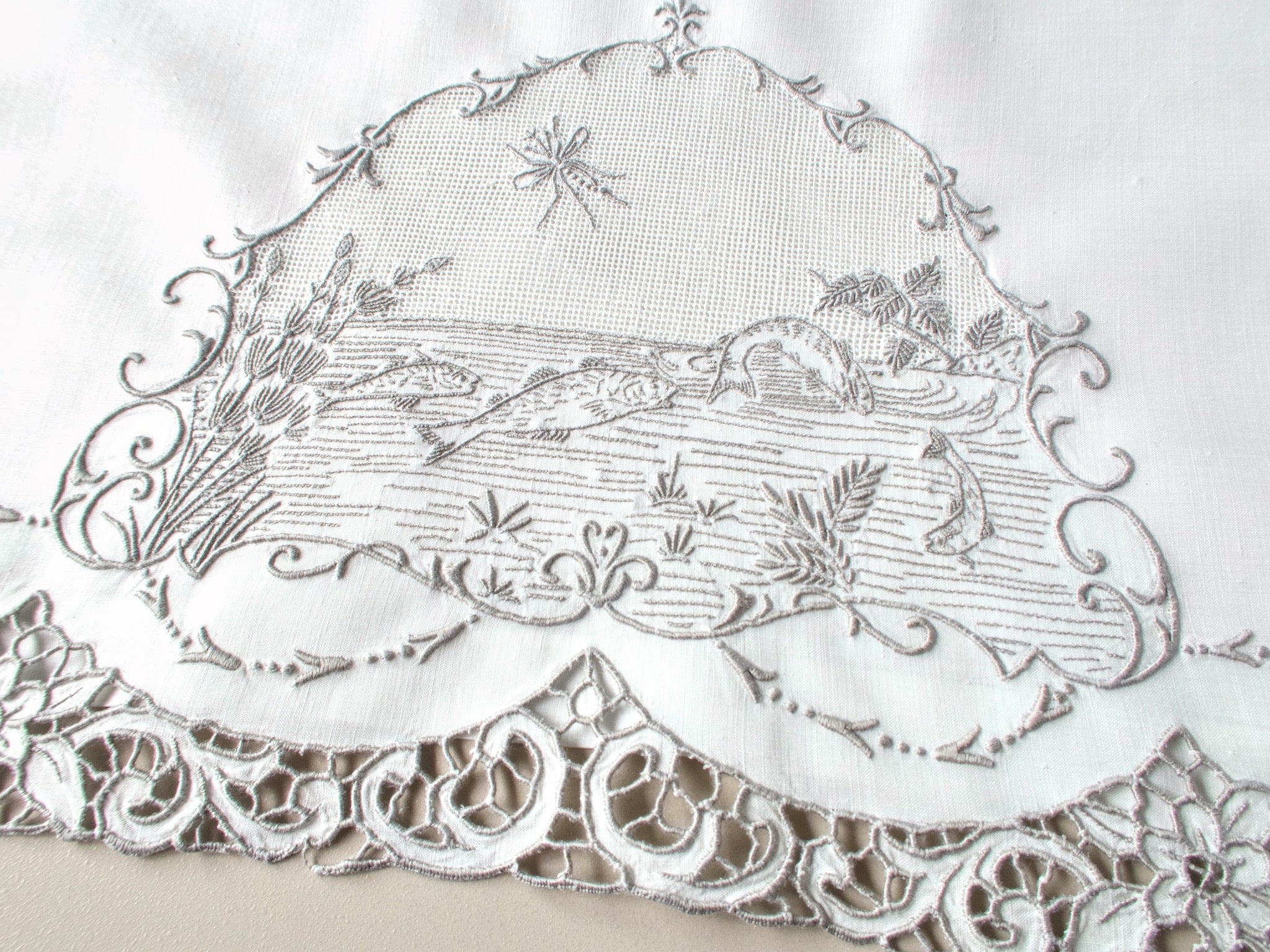 Fish in the shallows, swimming among reeds and water plants, with a dragonfly overhead — all hand embroidered on fine linen with a scrolling floral border in Richelieu. The style suggests Appenzell, but we believe this is Italian.
