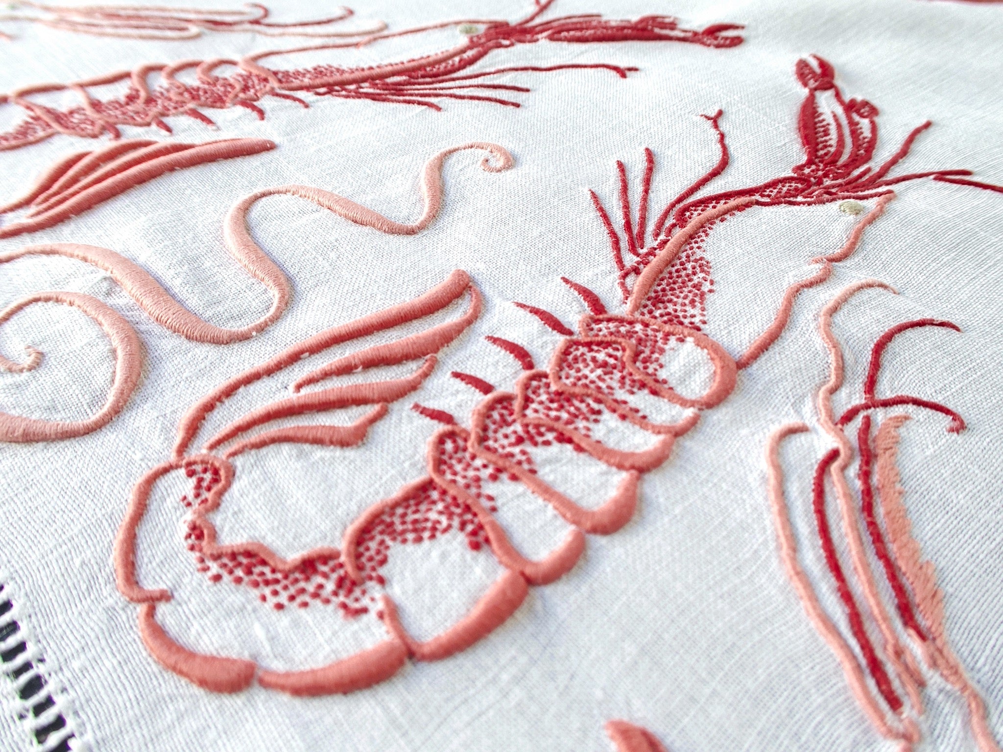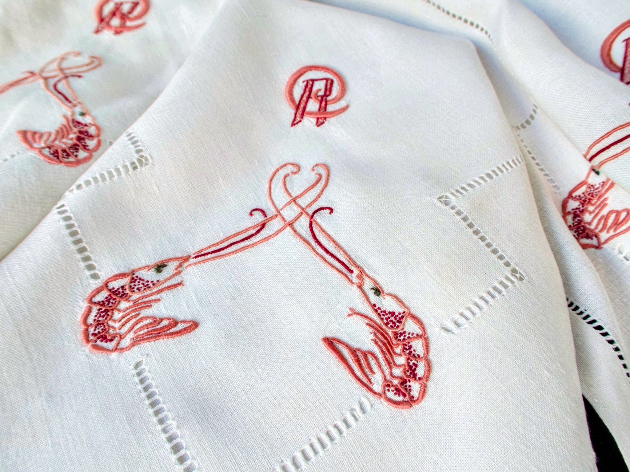 Sea creatures have graced the grand French table for centuries — but rarely like this. Hand embroidered langoustines, rendered in extraordinary, almost three-dimensional detail: every claw, every antenna, every segment of the tail. A full tablecloth and eight generous 29-inch napkins, handmade in France circa 1900. We have never seen anything quite like it.