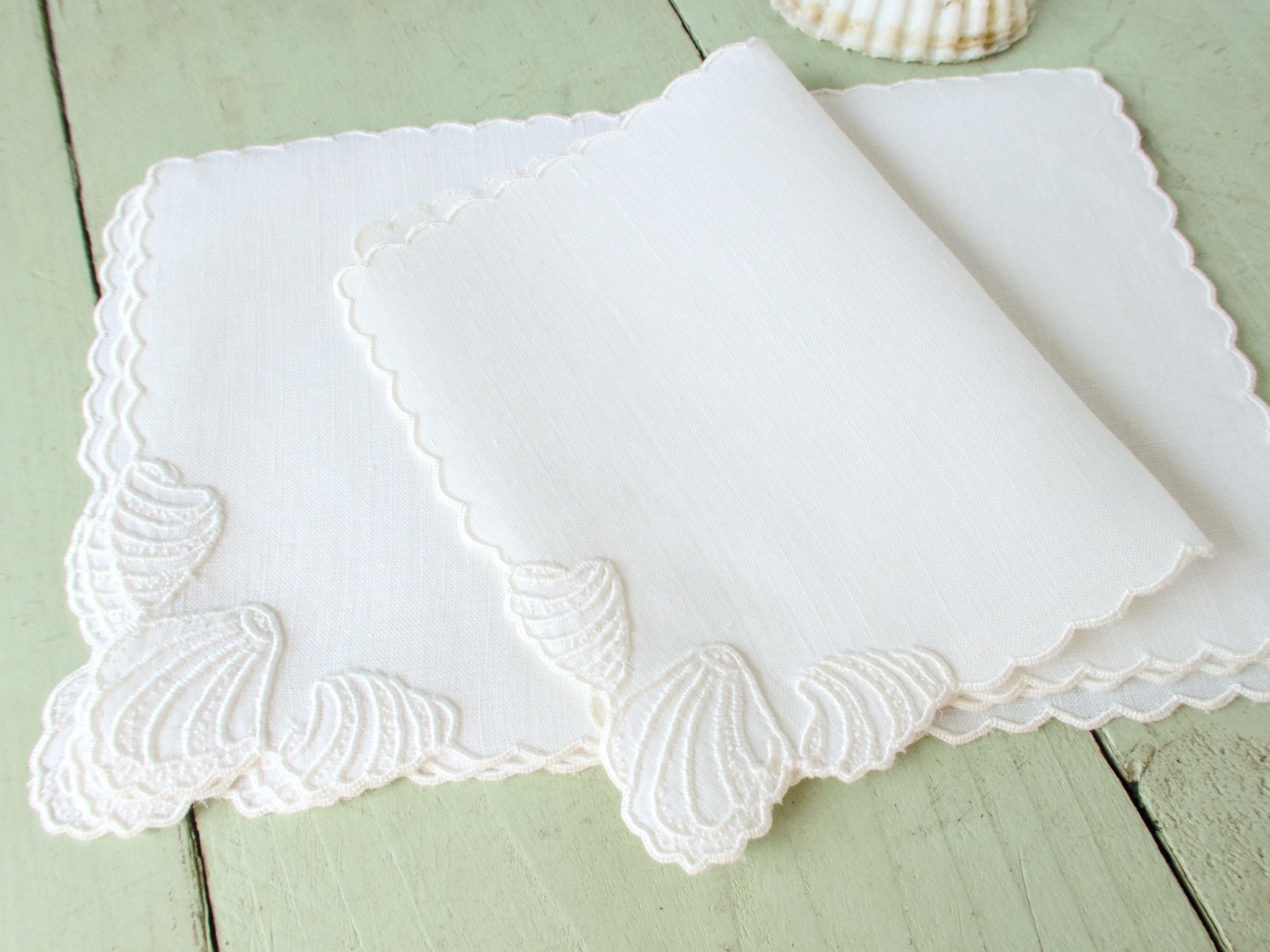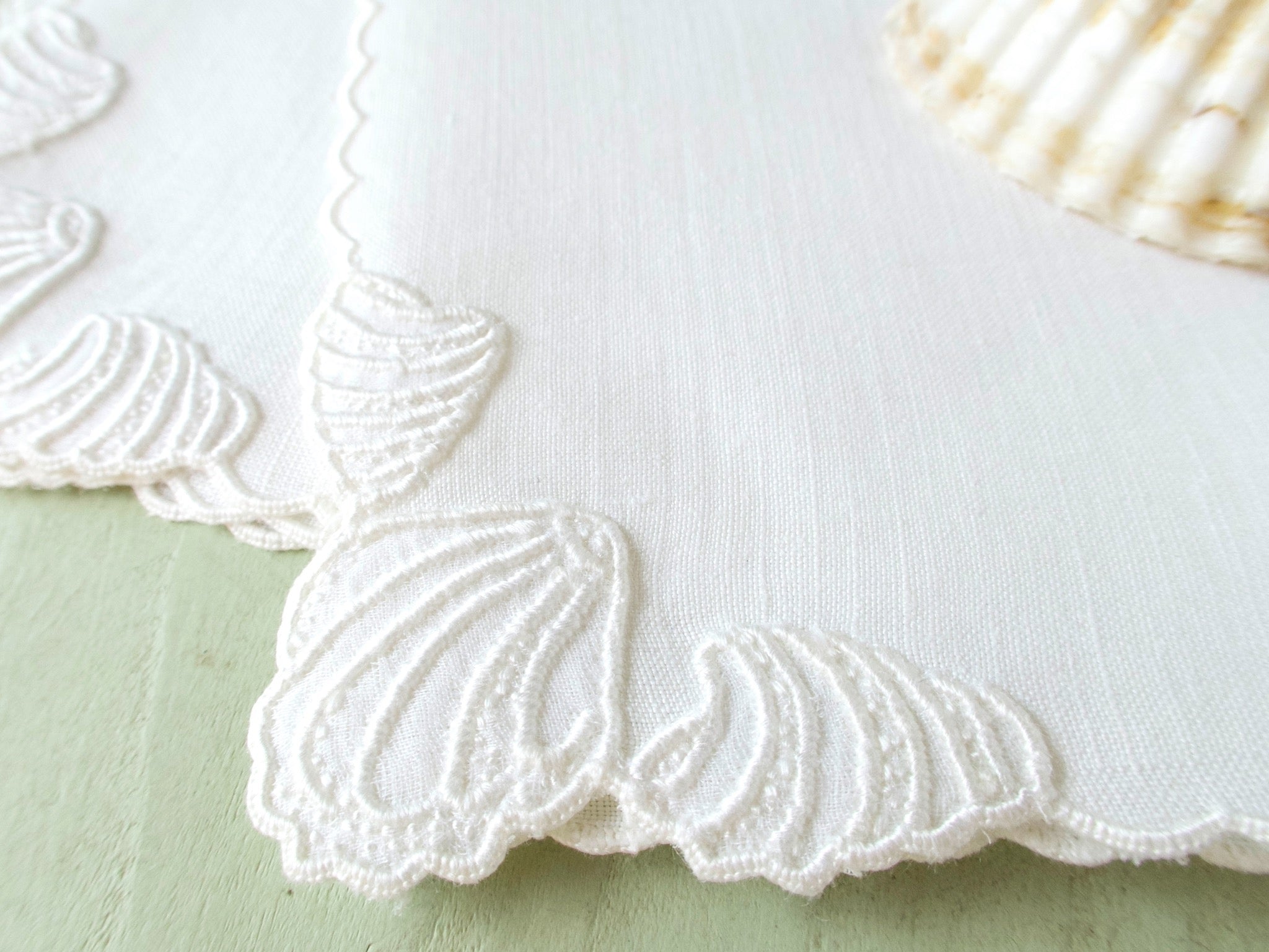White shells on creamy white Irish linen. Textured and dimensional, beautifully worked, with finely scalloped edges. Vintage cocktail napkins, hand embroidered in Madeira.
