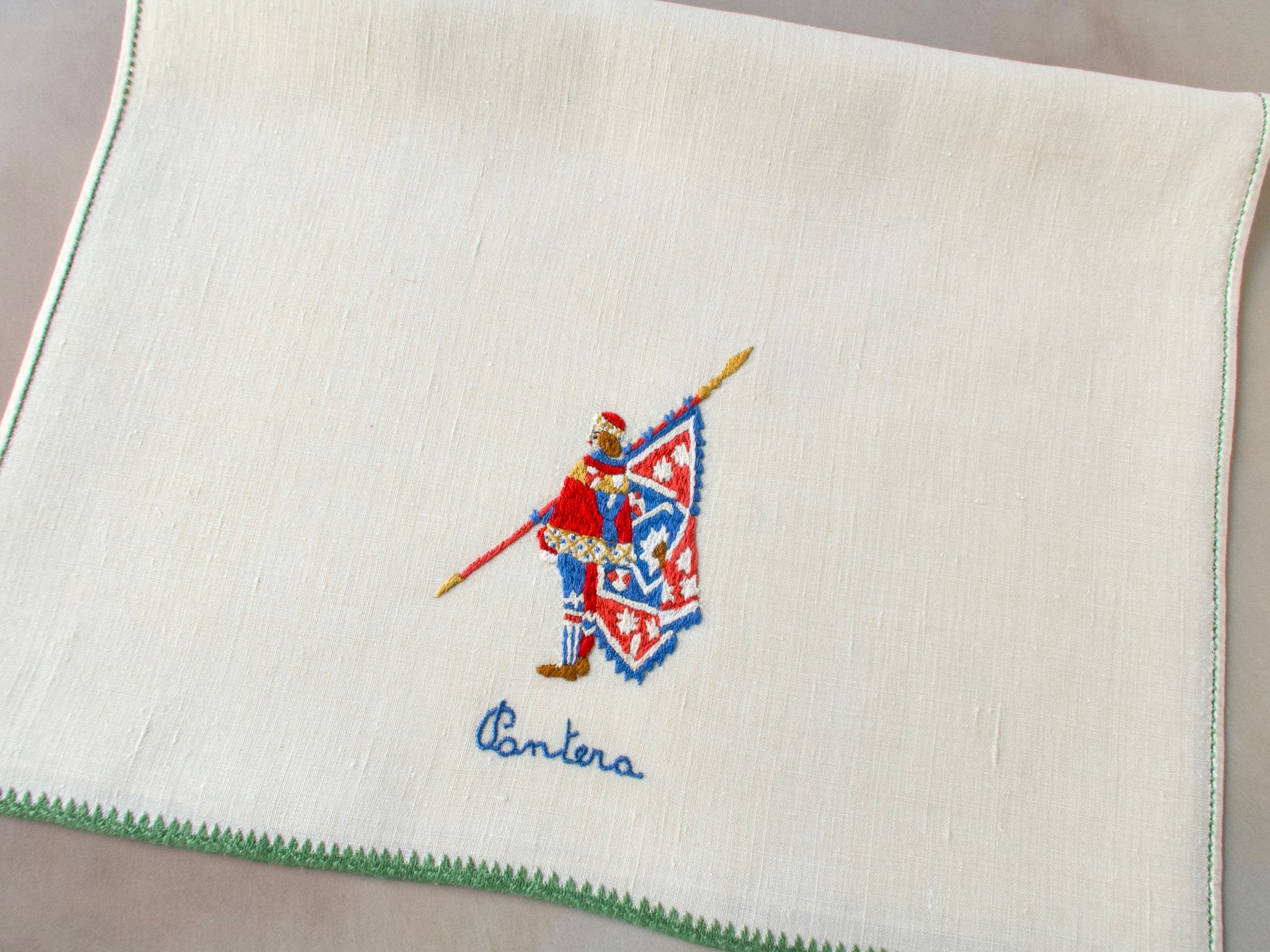 Vintage Rapisardi linen hand towel featuring the Contrada della Pantera flag bearer from the Siena Palio, hand embroidered in Italy.