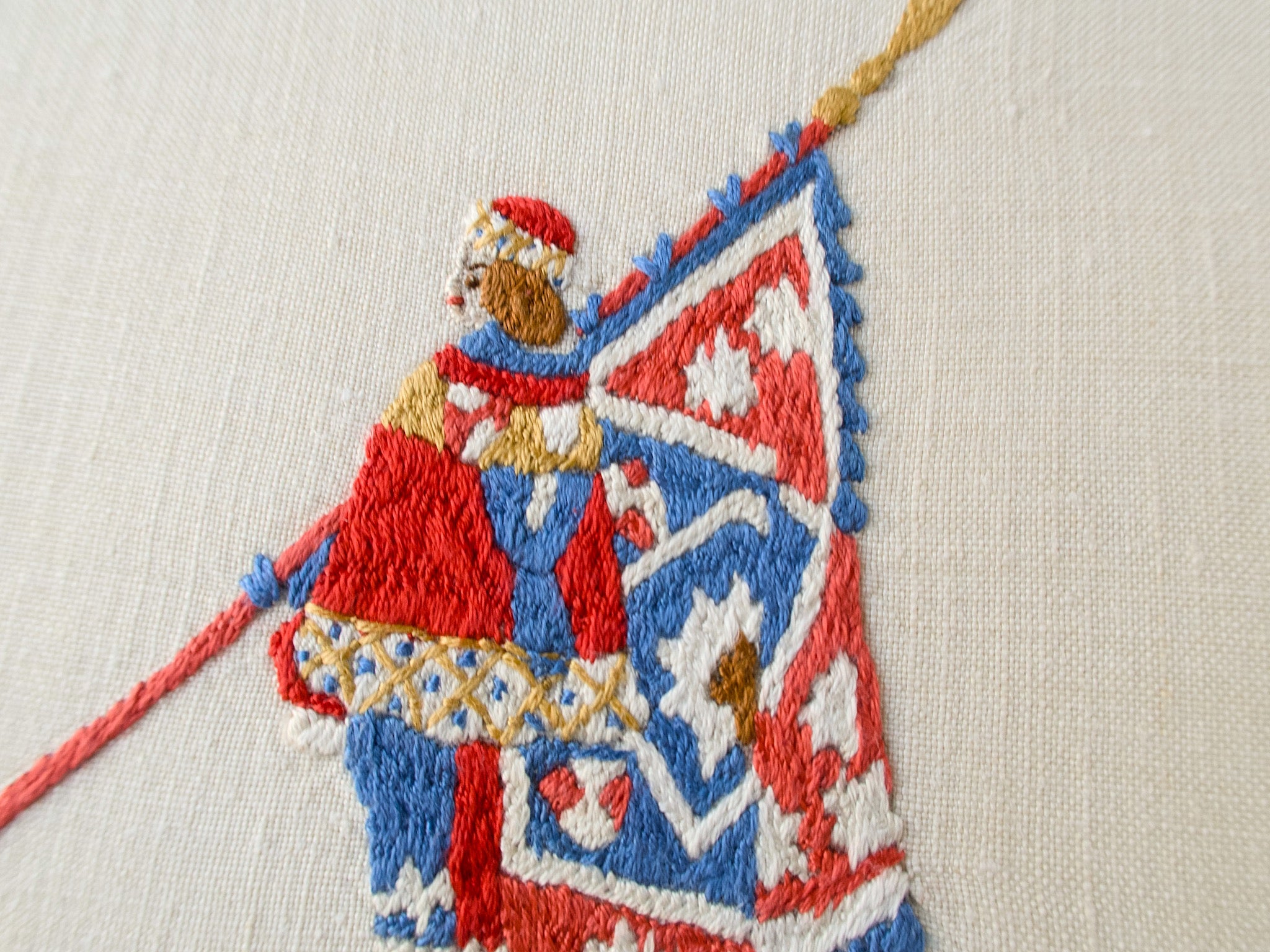 A proud Pantera alfieri (flag bearer) stands in full festival costume with his banner. The embroidery is beautifully worked and richly textured, the design drawing on the pageantry of Siena’s historic contrade and their centuries-old Palio horse race. Rapisardi often incorporated Italian regional traditions into her pieces—the Palio motifs are among the most distinctive.