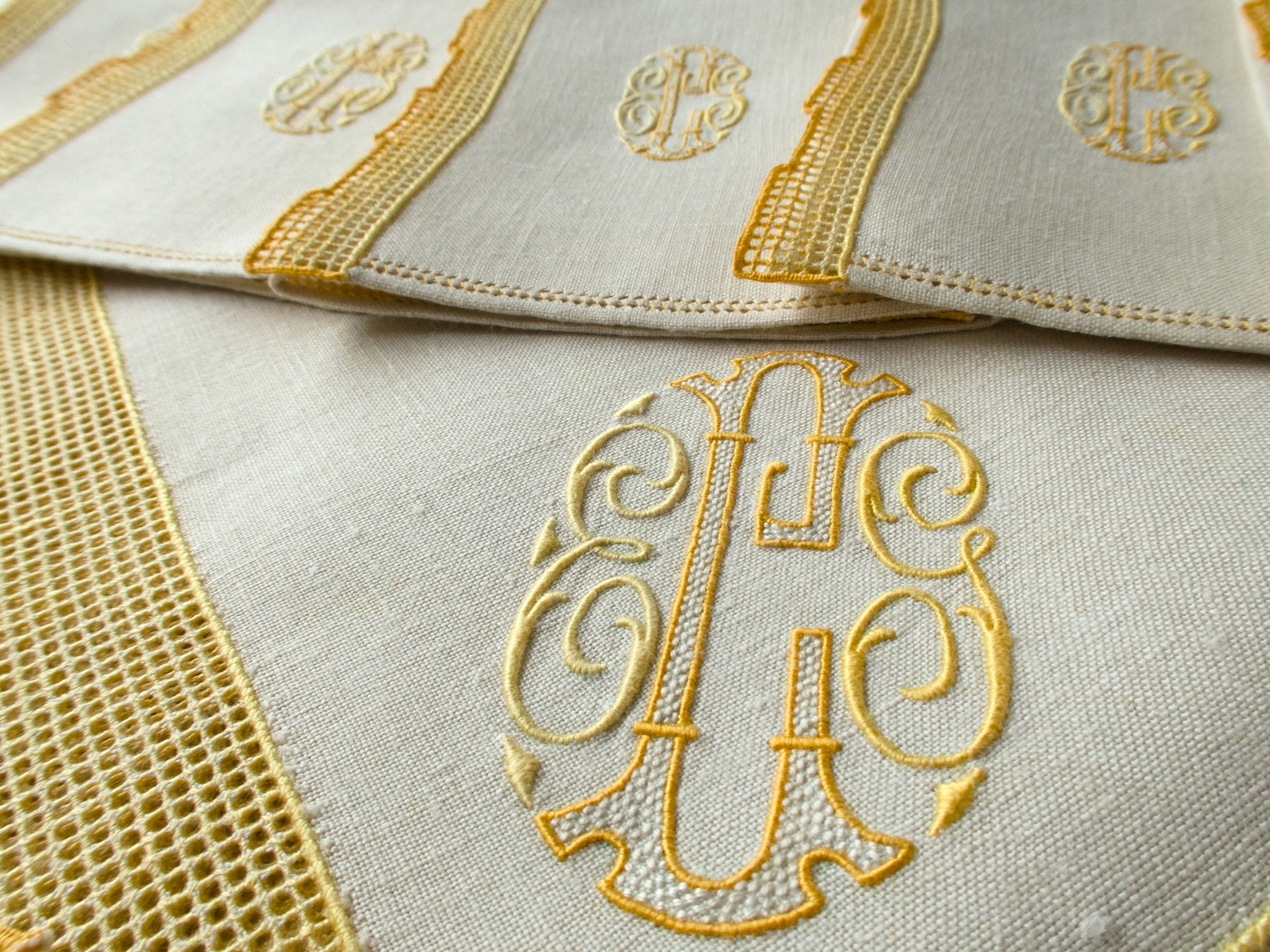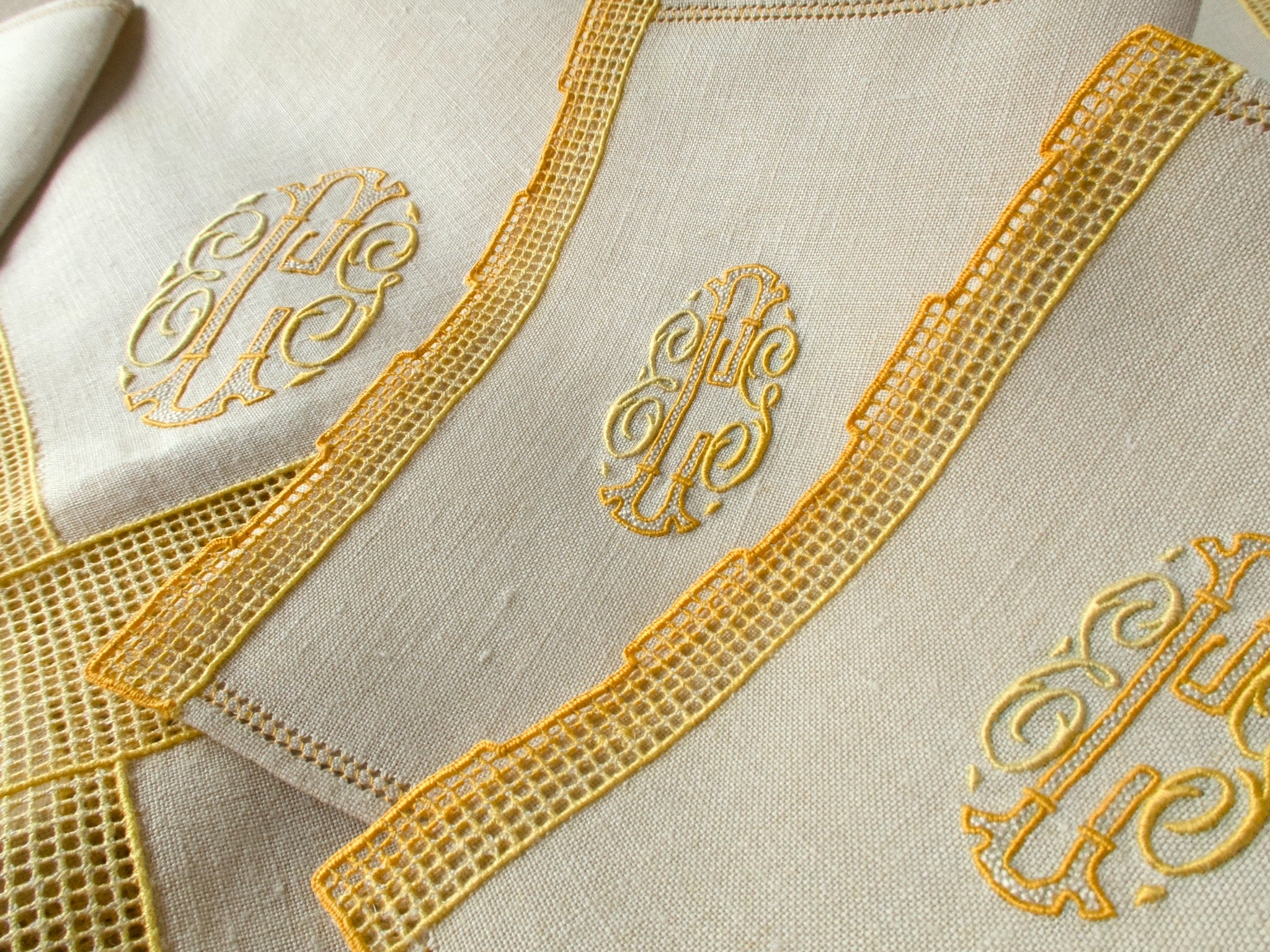 An exquisite vintage Italian linen set, combining dense drawnwork, elegant monograms, and a gorgeous ombré yellow. The workmanship is superb: elaborate borders, lettering of rare finesse, and the richness of color all speak to its artistry. The extra-long cocktail napkins — seldom encountered — make the set even more exceptional.