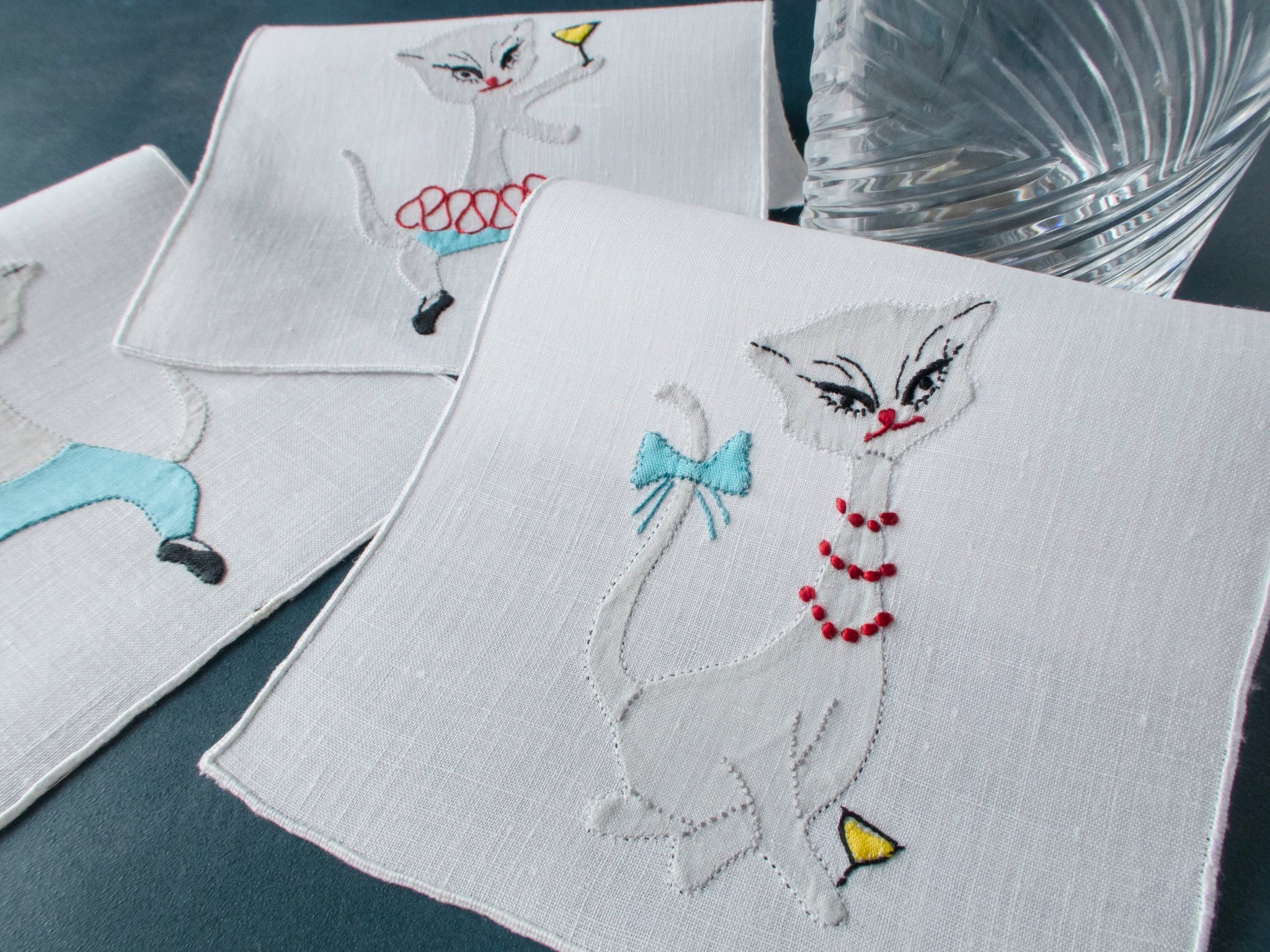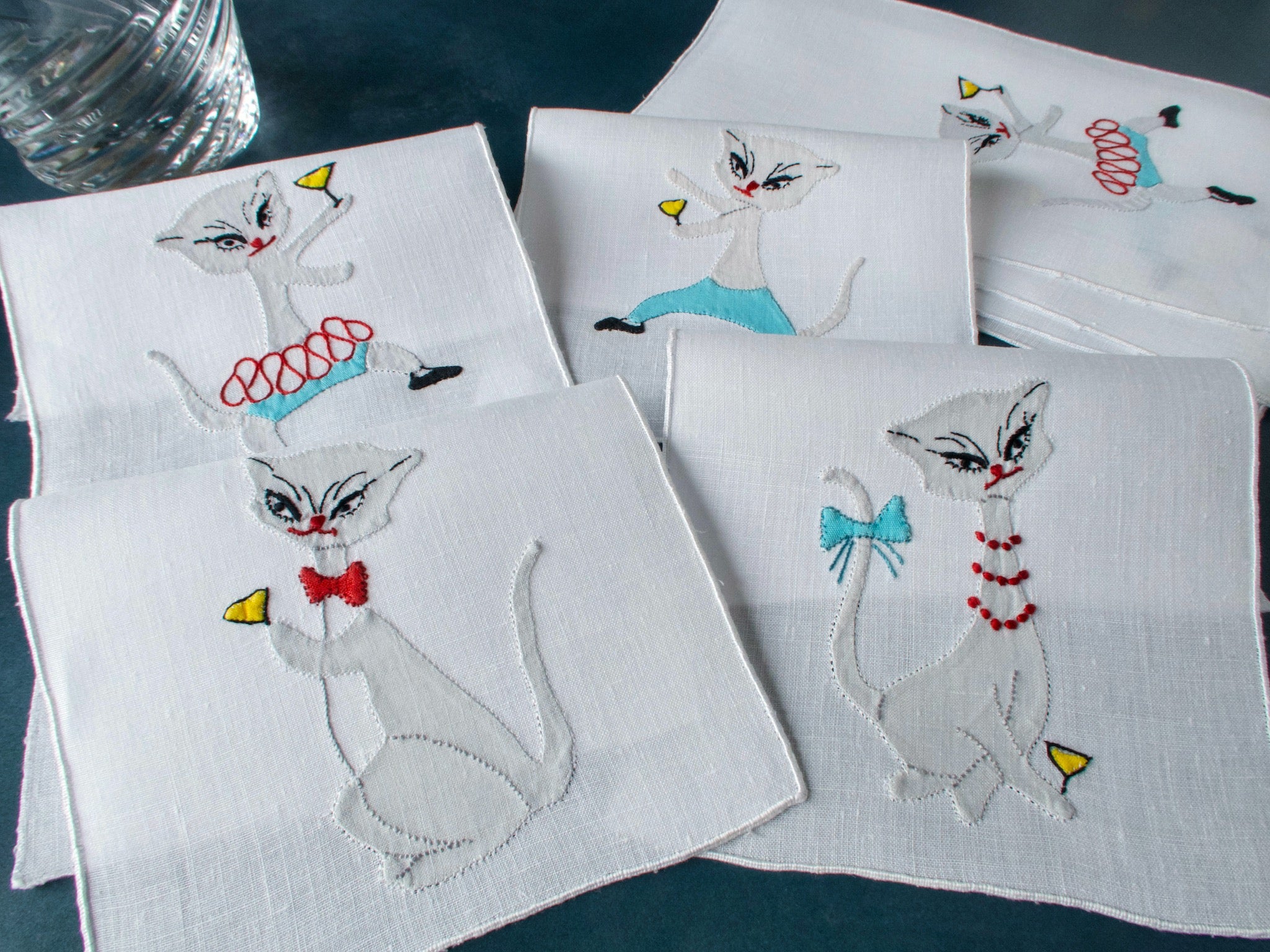 Vintage linen cocktail napkins, featuring cats at a party. Hand embroidered in Madeira. A rare and playful set for feline fans.