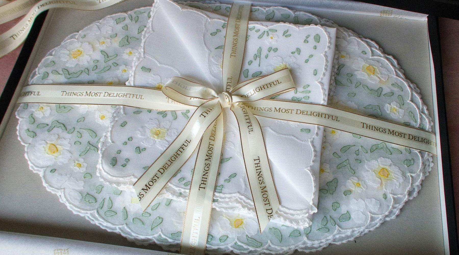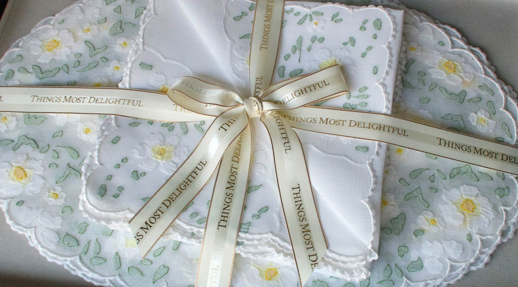 At Things Most Delightful, we carefully pack and ship each order within 7 days, ensuring your linens arrive safely and beautifully presented. Domestic shipping is always free, international orders ship via UPS, with rates based on package weight and destination.