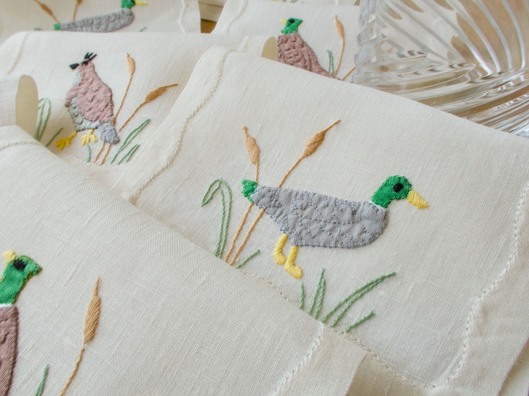 Vintage linen cocktail napkins featuring sporting birds, hand embroidered in Madeira. A lush set, perfect for fall.
